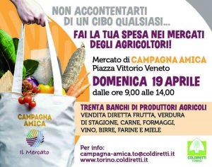 TORINO La mattina di domenica 19 aprile – dalle ore 9 alle 14 – Coldiretti Torino allestisce un mercato di Campagna Amica in piazza Vittorio Veneto. Sul mercato trenta banchi gialli dei produttori in vendita diretta del circuito di Campagna Amica. Sui banchi: ortofrutta di stagione, carne, formaggi, vino birre agricole, farine e miele e decine di trasformati. Tra i prodotti a chilometri zero, legati al territorio e stagionali, offerti ai consumatori torinesi, alcune primizie, fra cui gli asparagi di Santena e del Pianalto di Poirino.